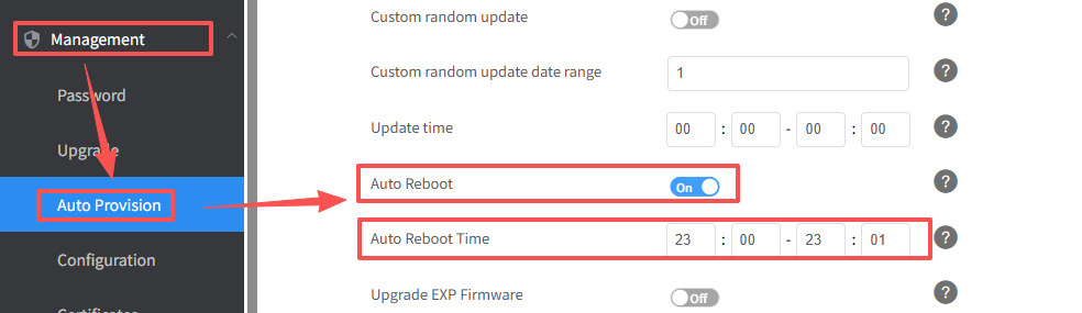 If you want to set auto scheduled reboot in your phone, you can enter Management->Auto Provision. Turn the Auto Reboot on and set the reboot time.