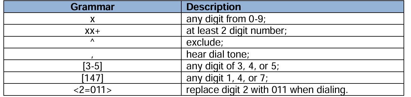 You need to know the following basic regular expression syntax when creating dial plan: