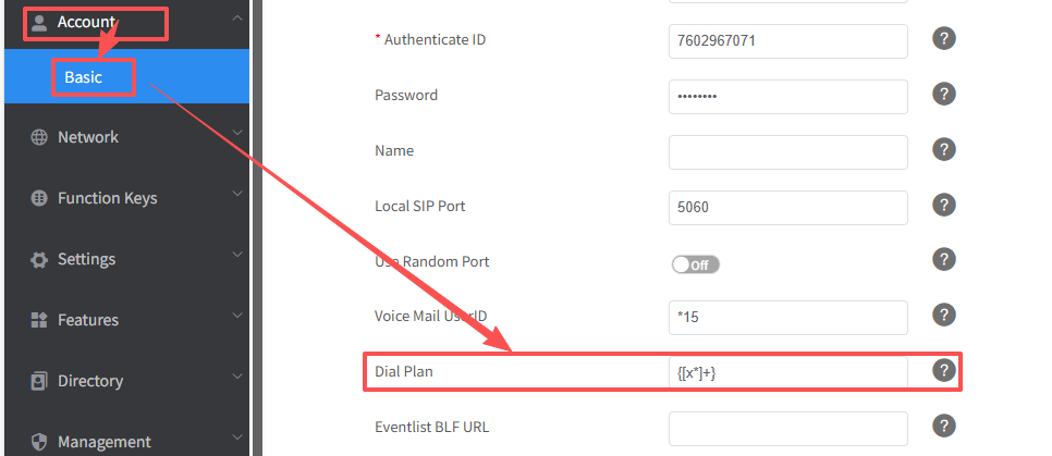 1. Enter Account→Basic→Dial Plan.