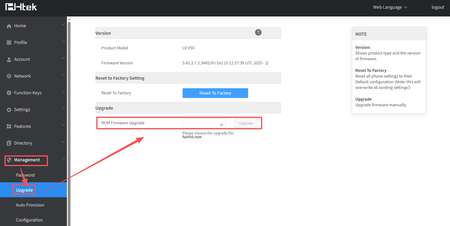 2. Please log on Webpage,Management->Upgrade->ROM Firmware Upgrade, choose the FW file and click Upgrade.