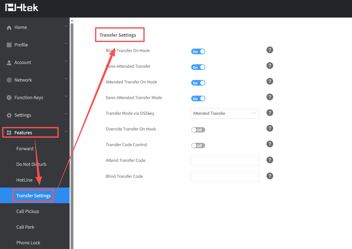 1. Log in the web interface and click Features->Transfer Settings.Turn on the transfer mode you need.