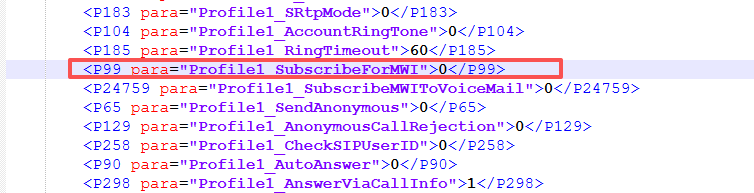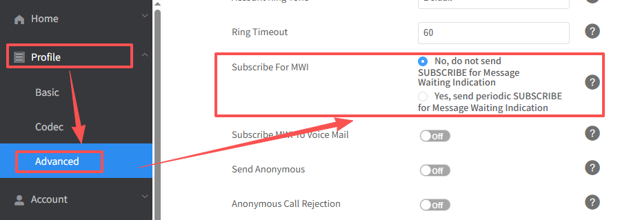 - On the web user interface, go to Profile > Advanced > Subscribe for MWI > No.